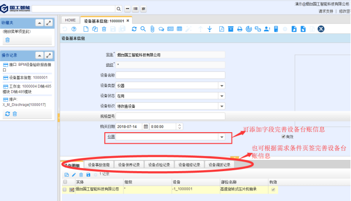 國工智能設備管理系統通過對設備的臺賬管理、制定的周期性及臨時性的保養計劃、巡檢計劃,按時生成的保養、巡檢任務,及設備日常的報修、維修,備品備件的領取,設備的缺陷記錄等功能,對設備實現全生命周期的管理。