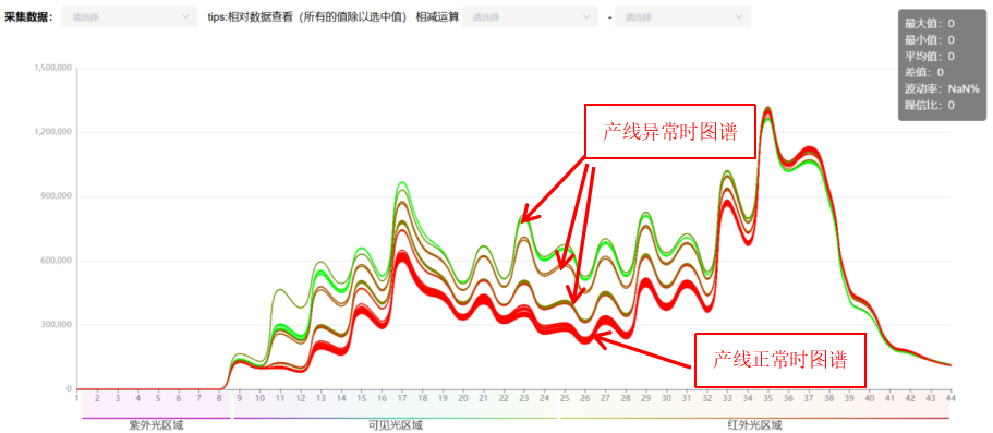上圖是采集的產線不同時期的光譜圖,紅色部分是正常生產時硝酸鐵溶液的圖譜。產線異常時,硝酸鐵濃度變化,其光譜圖也發生明顯的變化,在線光譜儀可用于產線異常判斷。