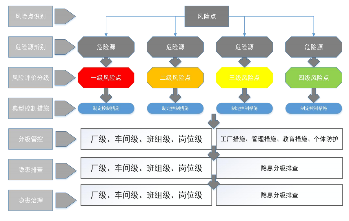 從風險分級管控方面:按照風險不同級別、管控資源、管控能力、管控措施復雜及難易程度等因素來確定不同管控層級的風險管控方式,確定了管控方式,也就有了隱患排查的方向。風險越大,管控級別越高。必須做到上級負責管控的風險點,下級也必須負責管控,層層負責。